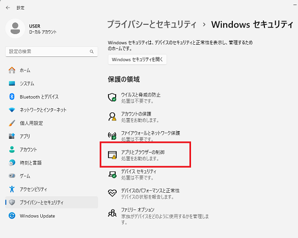 3.「アプリとブラウザーの制御」をクリックして下さい。
